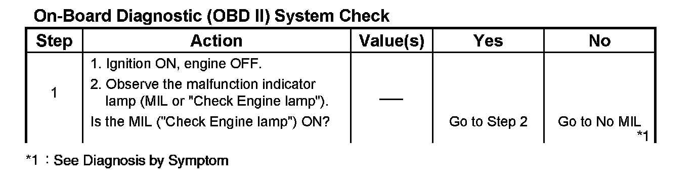 1. The MIL ("Check Engine" lamp) should be ON steady with the ignition ON/engine OFF. If not, isolate the malfunction in the MIL circuit.