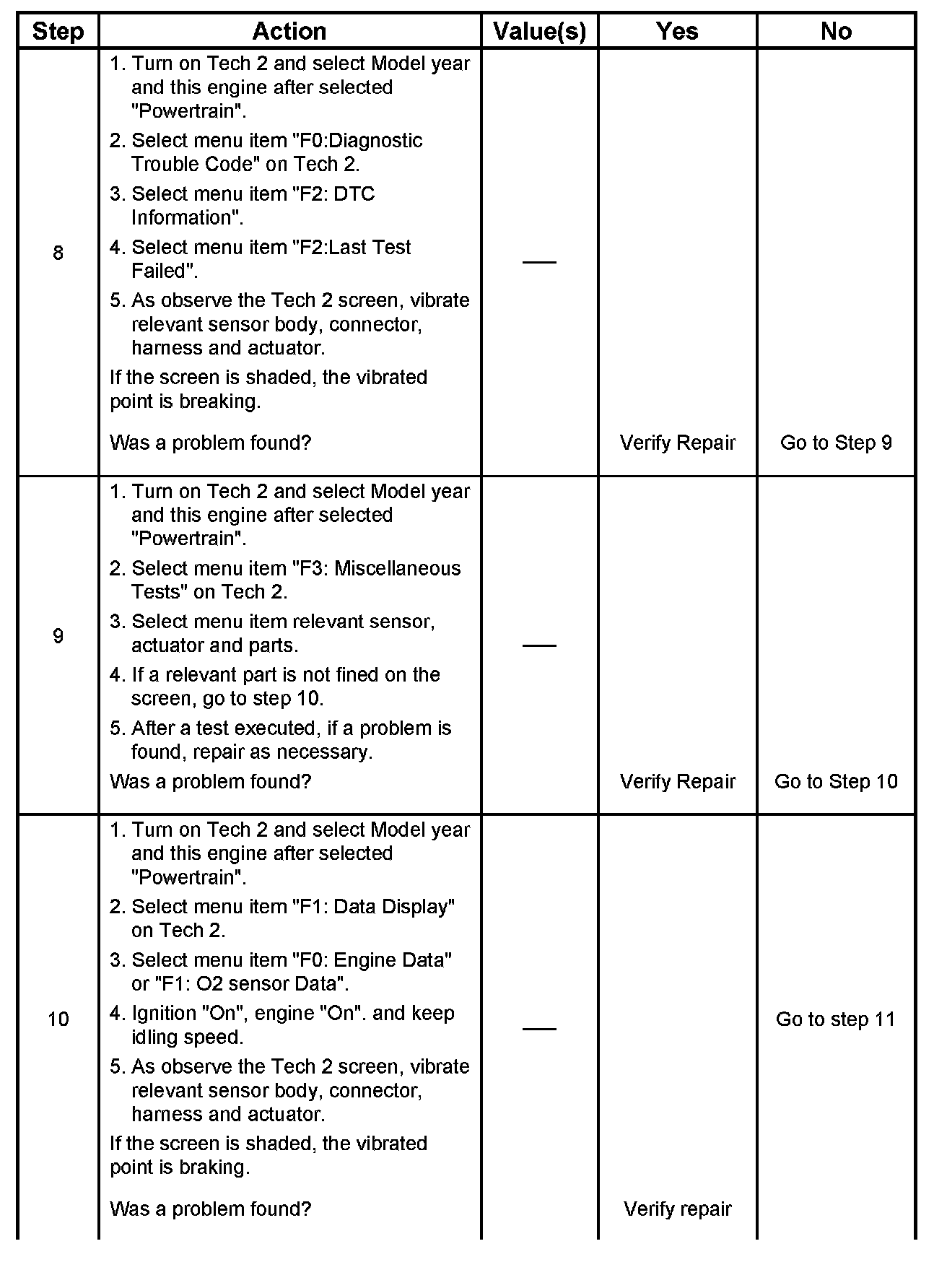 2. Ignition on, engine on. Check flashing check engine lamp. If it keeps flashing, Check Diagnosis Trouble Code (DTC) at Tech 2.