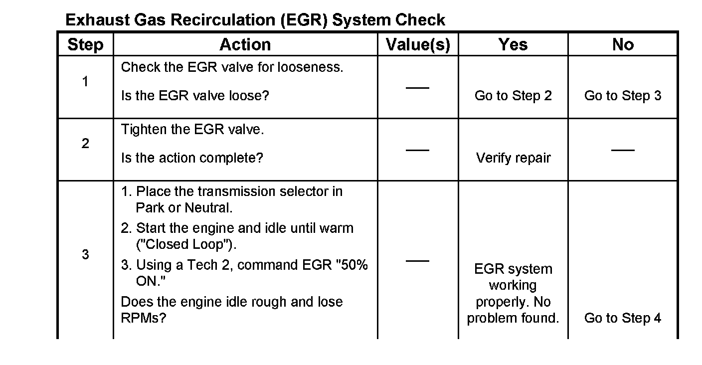 The EGR valve chart is a check of the EGR system. An EGR pintle constantly in the closed position could cause detonation and high emissions of NOx. It could also result in high long term fuel trim values in the open throttle cell, but not in the closed throttle cell. An EGR pintle constantly in the open position would cause rough idle. Also, an EGR valve mounted incorrectly (rotated 180 °) could cause a rough idle without setting an EGR DTC. Check for the following items: