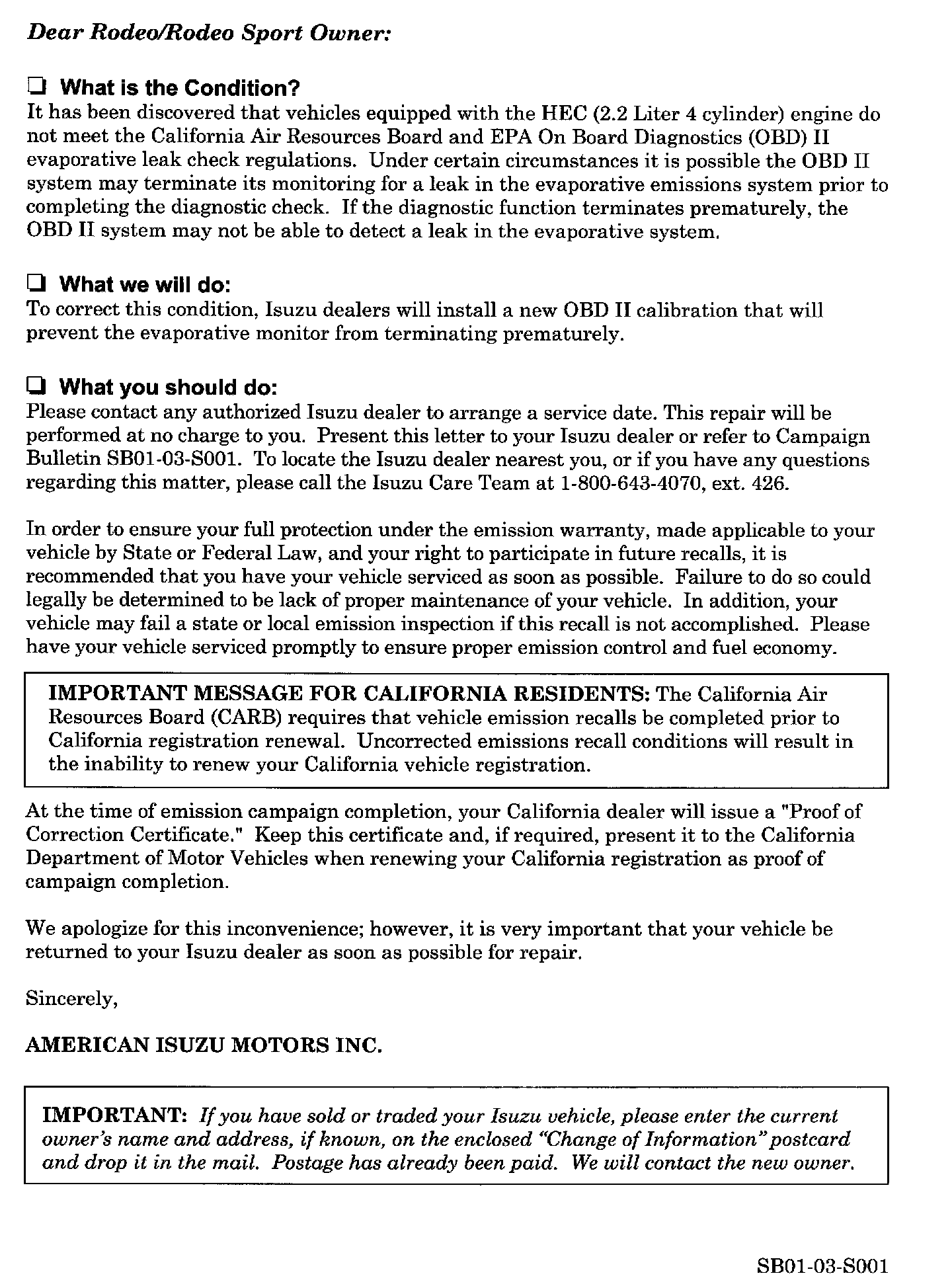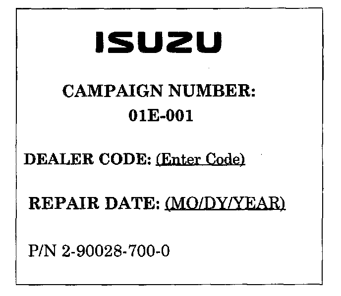 California dealers must issue a "Proof of Correction Certificate" to Isuzu owners. Advise the Isuzu owner to keep the certificate as the California Deparment of Motor Vehicles may ask for proof of this campaign completion before renewal of the registration.