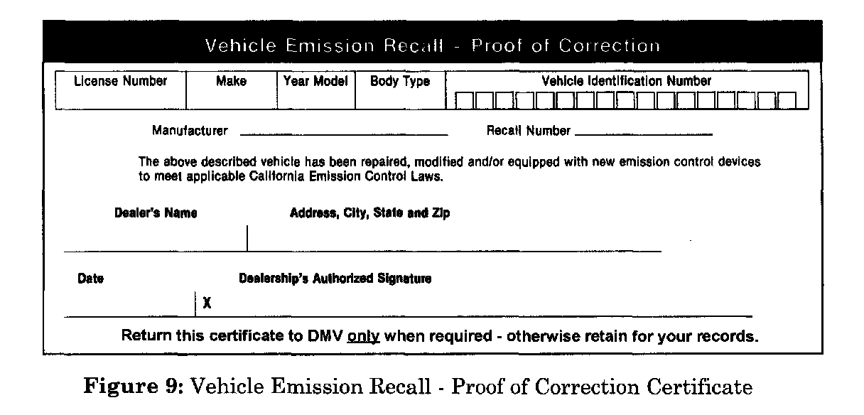 At the time of emission campaign completion, all California dealers must issue a completed "Proof of Correction Certificate" (Figure 9) to the vehicle owner. A completed certificate is required by the vehicle owner to the Department of Motor Vehicles at the time of California vehicle registration renewal.