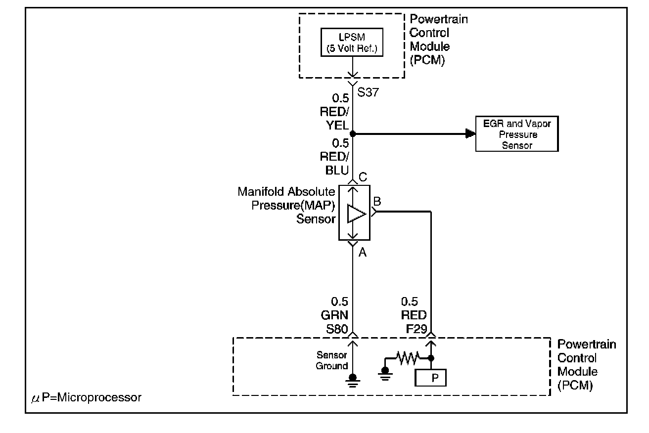The manifold absolute pressure (MAP) sensor measures the changes in the intake MAP which result from engine load (intake manifold vacuum) and engine speed changes; and converts these into a voltage output. The powertrain control module (PCM) sends a 5-volt reference voltage to the MAP sensor. As the MAP changes, the output voltage of the sensor also changes. By monitoring the the sensor output voltage, the PCM knows the MAP. A lower pressure (low voltage) output voltage will be about 1-2 volts at idle. Higher pressure (high voltage) output voltage will be about 4-4.8 volts at wide open throttle. The MAP sensor is also used, under certain conditions, to measure barometric pressure, allowing the PCM to make adjustments for different altitudes. The PCM uses the MAP sensor to diagnose proper operation of the EGR system, in addition to other functions.