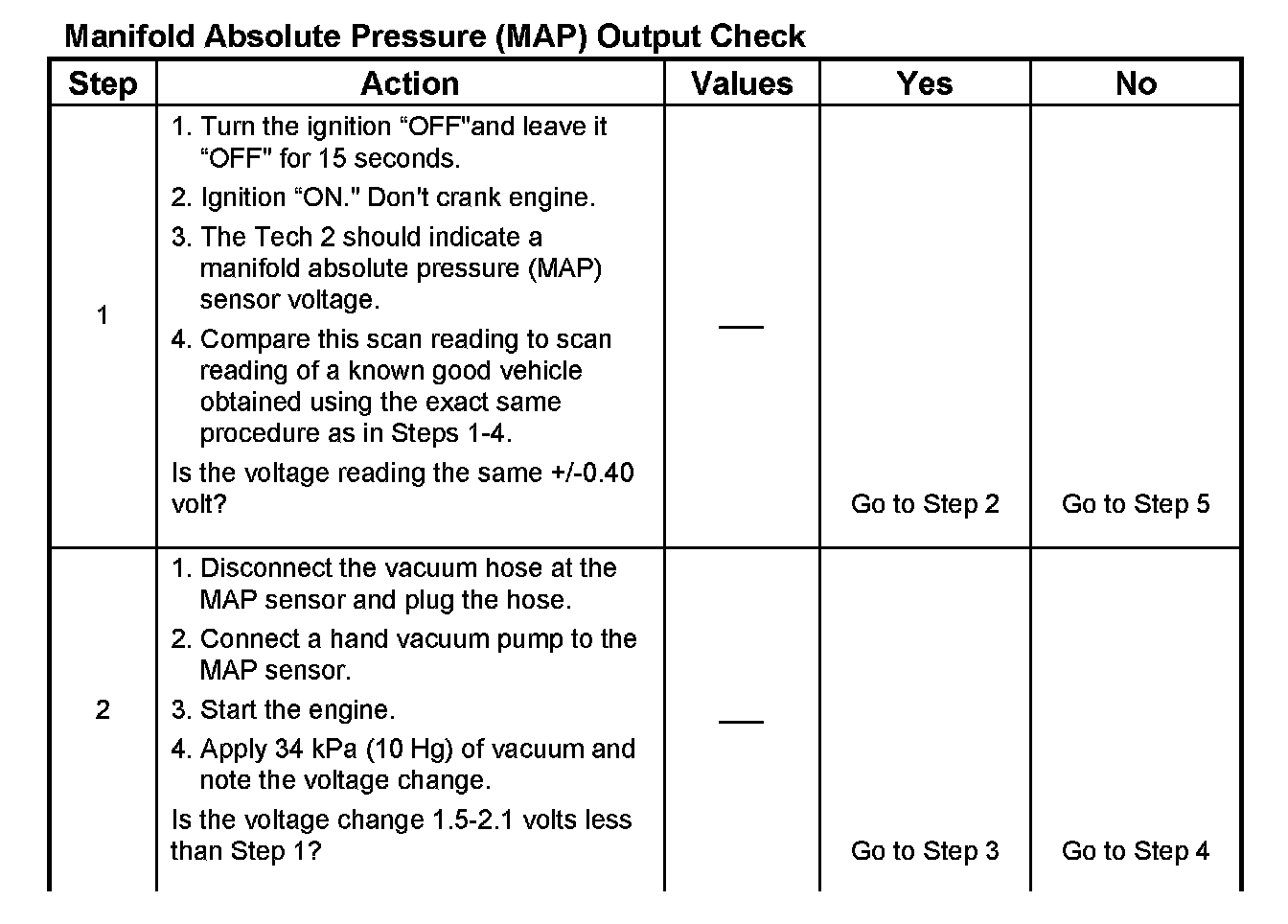 2. Applying 34 kPa (10 Hg) vacuum to the MAP sensor should cause the voltage to be 1.5 - 2.1 volts less than the voltage at step 1. Upon applying vacuum to the sensor, the change in voltage should be instantaneous. A slow voltage change indicates a faulty sensor.