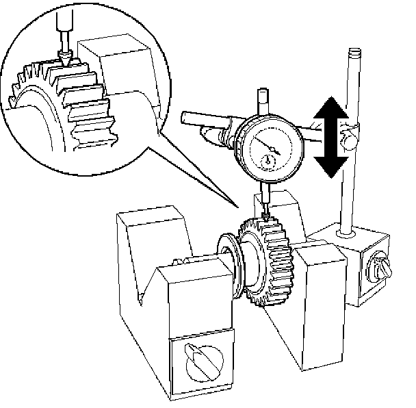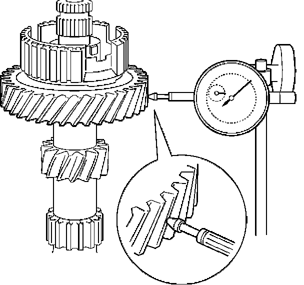 b. Using a dial indicator, measure the reverse idle gear radial clearance.