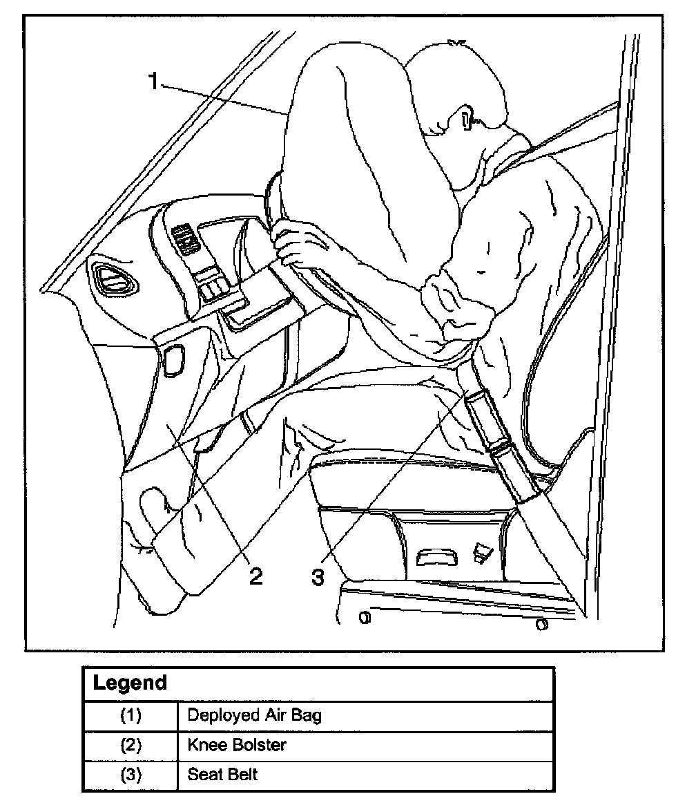 The air bag deploys when the vehicle is involved in a frontal crash of sufficient force up to 30 degrees off the centerline of the vehicle. To further absorb the crash energy there is a knee bolster located beneath the instrument panel for both the driver and passenger, and the steering column is collapsible.