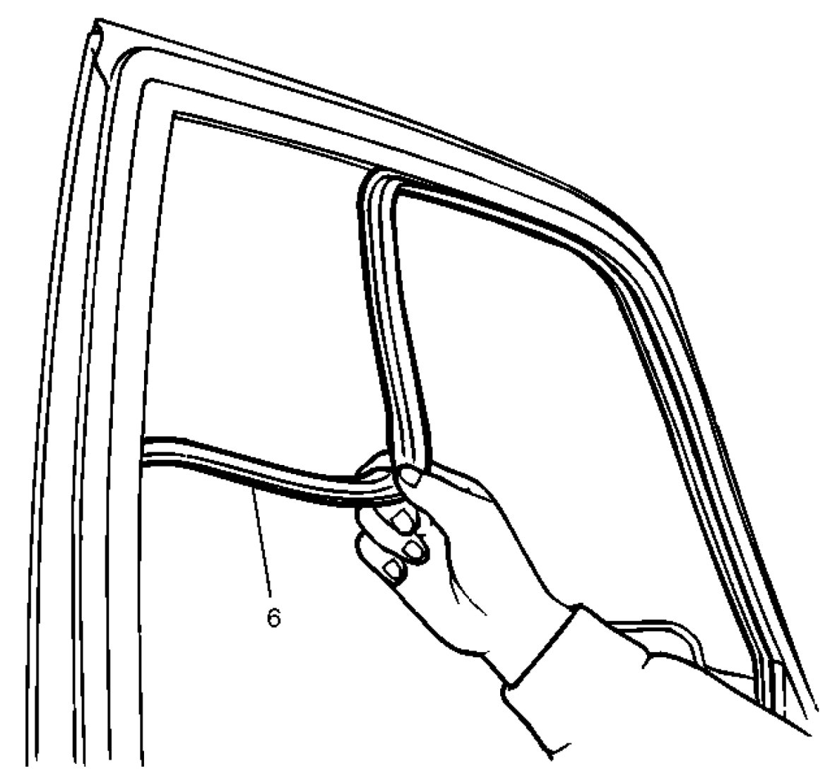 - Pull the glass run (6) out from the door frame groove.