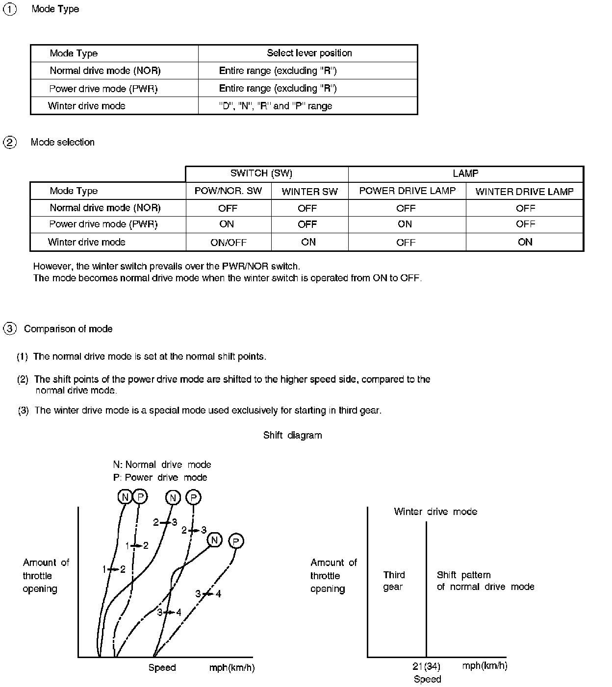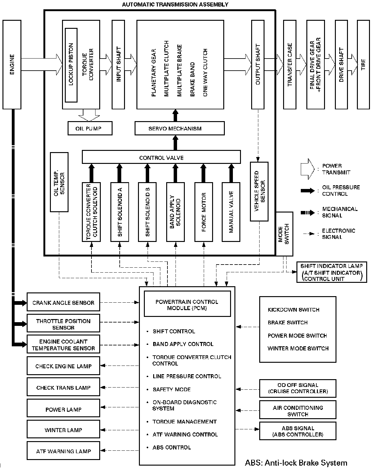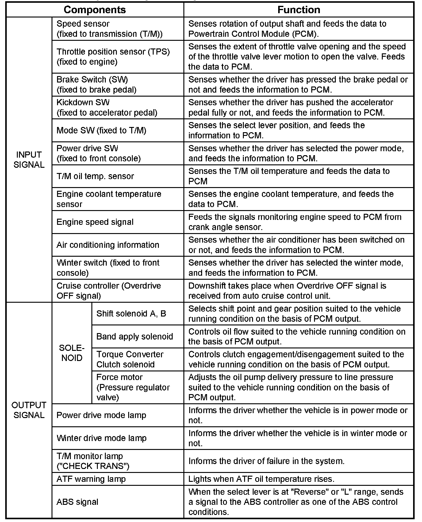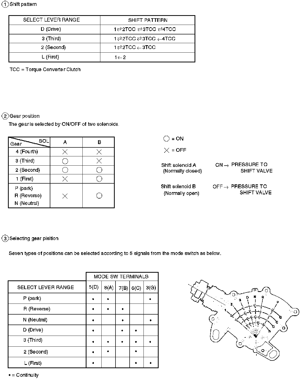 The transmission gear is shifted according to the shift pattern selected by the driver. In shifting gears, the gear ratio is controlled by the ON/ OFF signal using the shift solenoid A and the shift solenoid B.