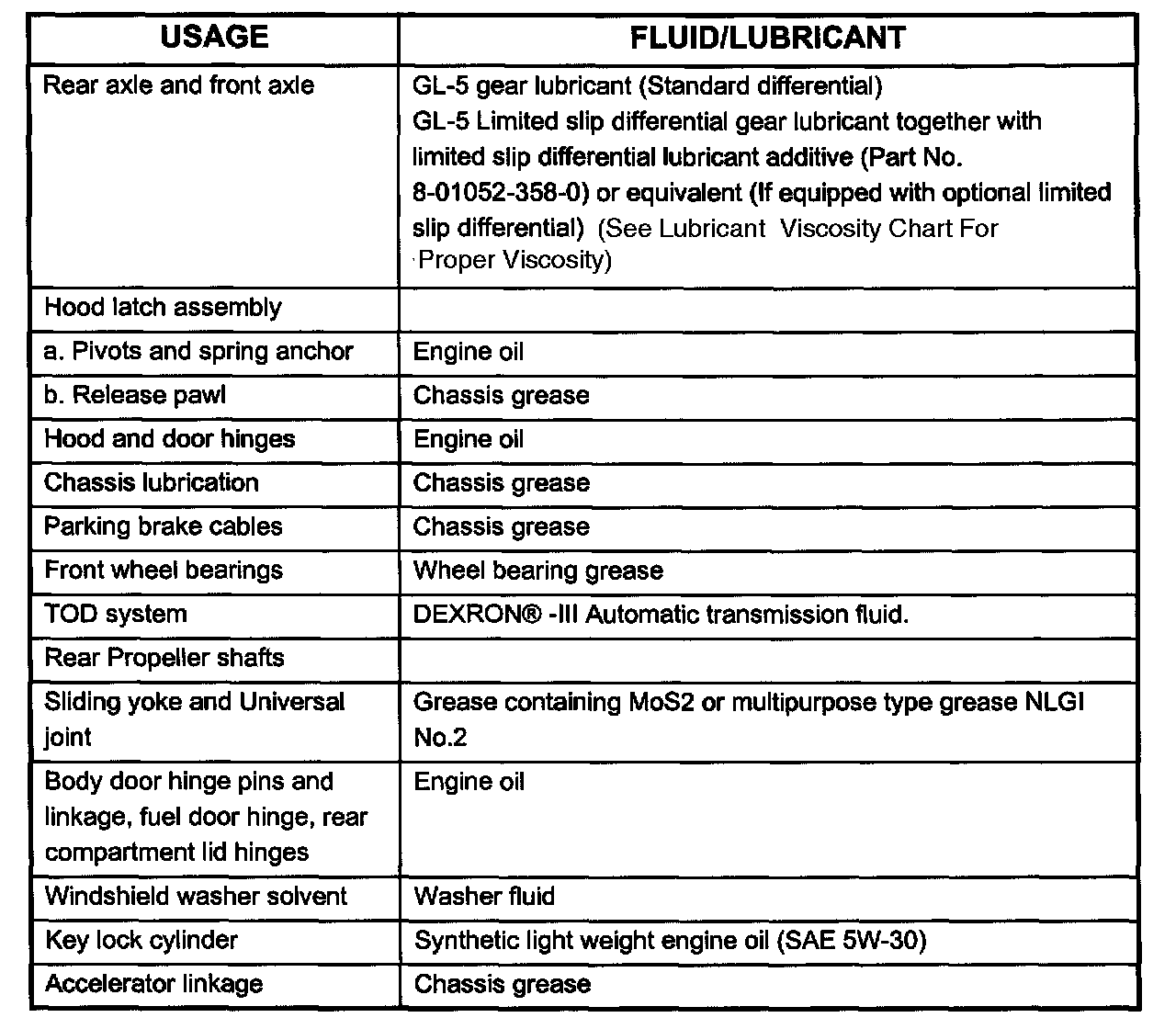 Recommended Fluids & Lubricants: