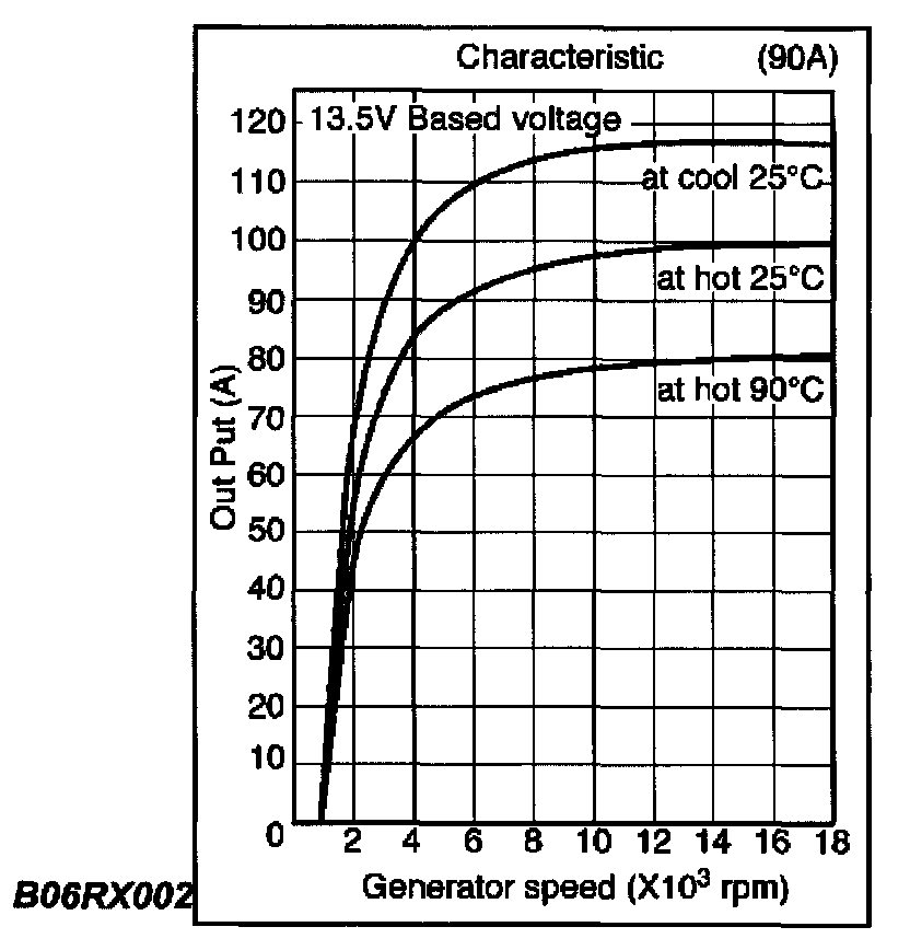 2. Conduct the generator characteristic test. Characteristics of generator are shown in illustration. Repair or replace the generator if its outputs are abnormal.