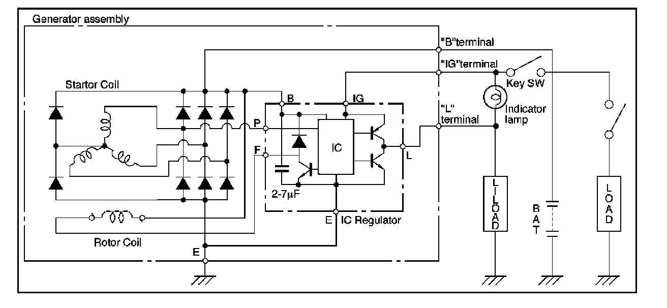 Disconnect wiring connector from generator, and ground the terminal "L" on connector side.