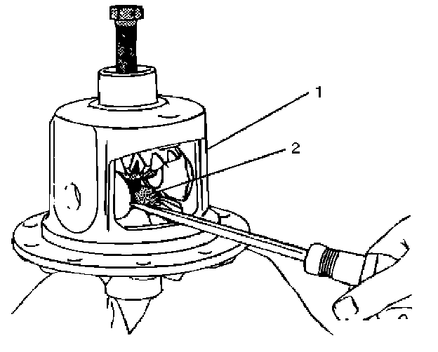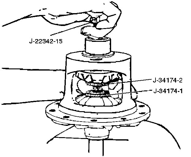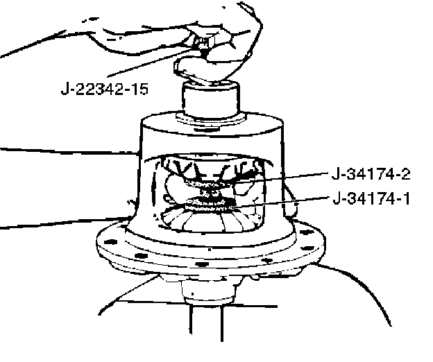 b. Install threaded screw cap J-34174-2 to top differential side gear. Thread forcing screws J-22342-15 into threaded screw cap until it becomes centered into the bottom cap.