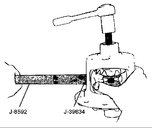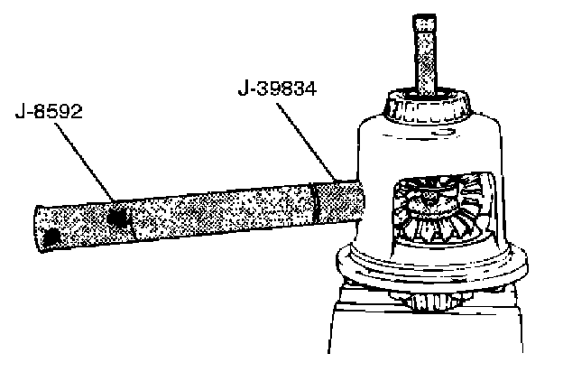 7. Assemble LSD service adapter J-39834 onto long drive handle J-8592.1nsert it into differential shaft hole of case. Pull on handle and rotate case until pinion mate gears can be removed.