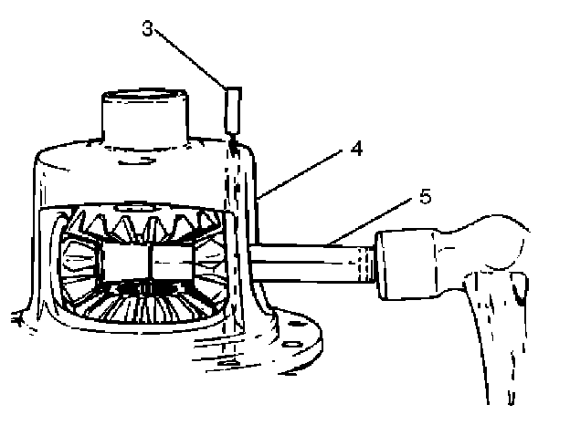 12. Position differential shaft in case and drive in with hammer. Be sure lock pin hole of differential shaft (5) is properly aligned to allow installation of lock pin (3). Be sure that thrust washers and differential pinion mate gears are aligned with the differential case (4). Install new lock pin to proper depth using a punch.