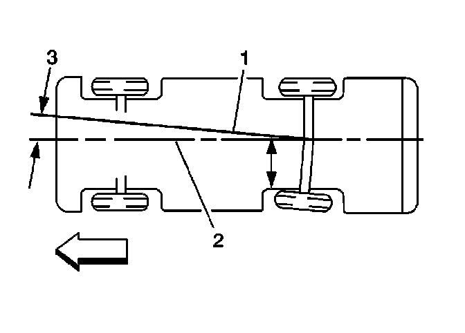 Thrust Angles DescriptionThe front wheels aim or steer the vehicle. The rear wheels control tracking. This tracking action relates to the thrust angle (3). The thrust angle is the path that the rear wheels take. Ideally, the thrust angle is geometrically aligned with the body centerline (2). In the illustration, toe-in is shown on the left rear wheel, moving the thrust line (1) off center. The resulting deviation from the centerline is the thrust angle.