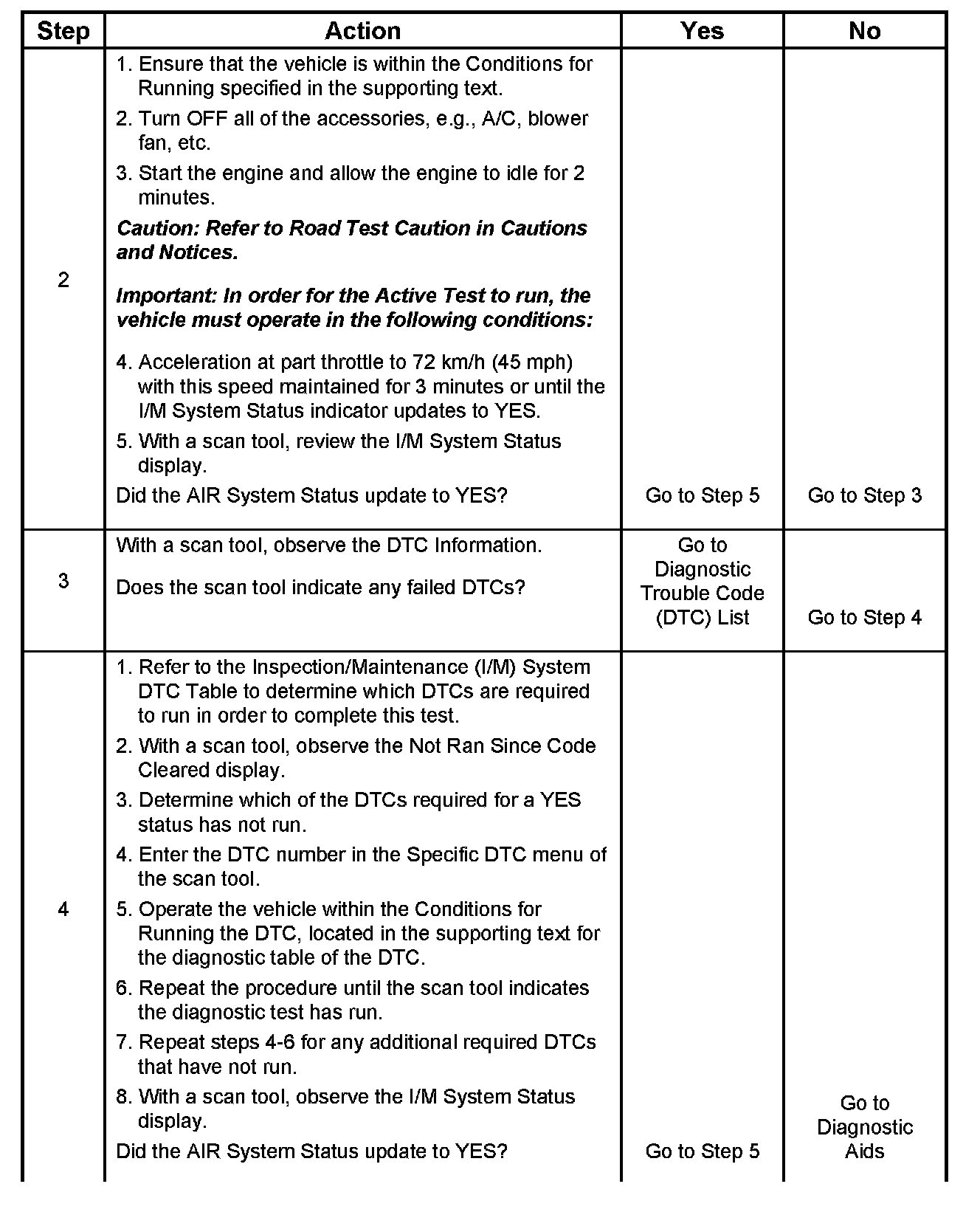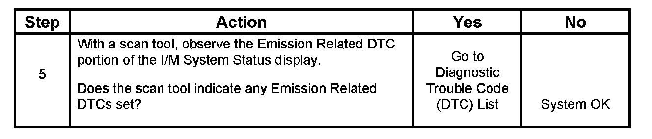 3. This step identifies a first failure of a type B DTC. A DTC only appears on the I/M System Status display when the DTC becomes a MIL illuminating DTC. This occurs on the second failure of a type B DTC. A first failure of a type B DTC will not allow the I/M System Status to update to YES. Refer to Diagnostic Aids.