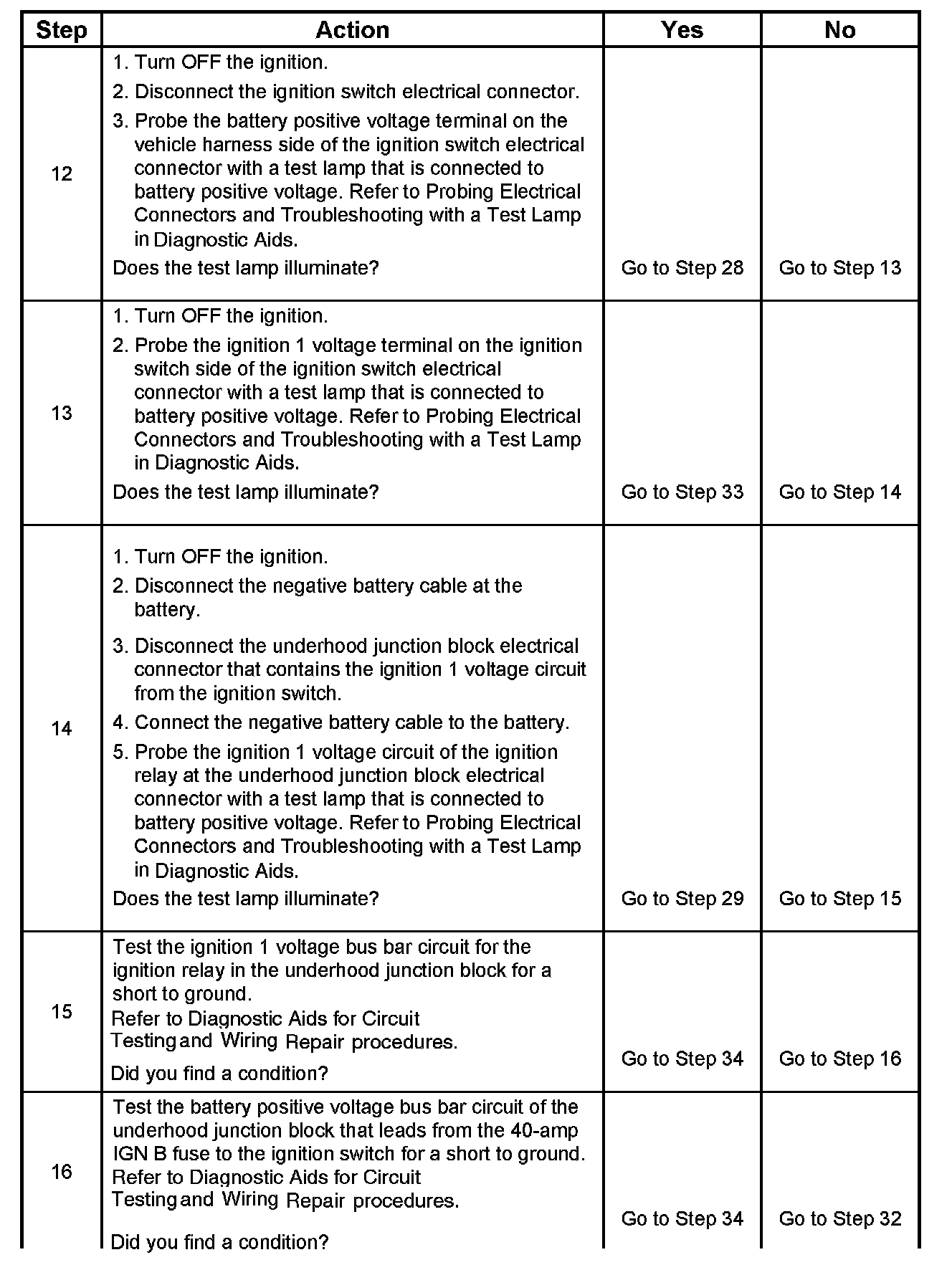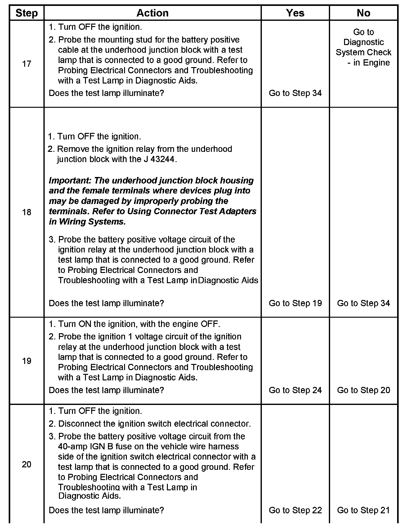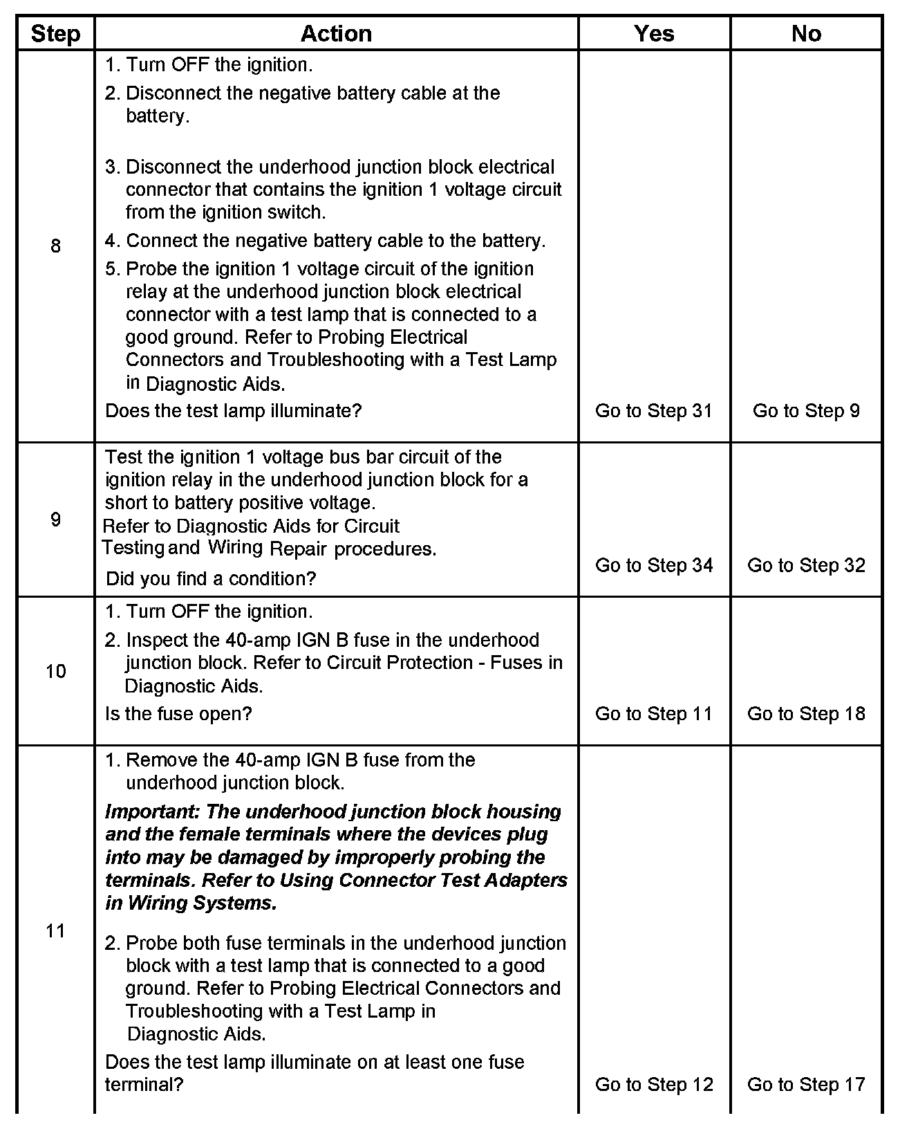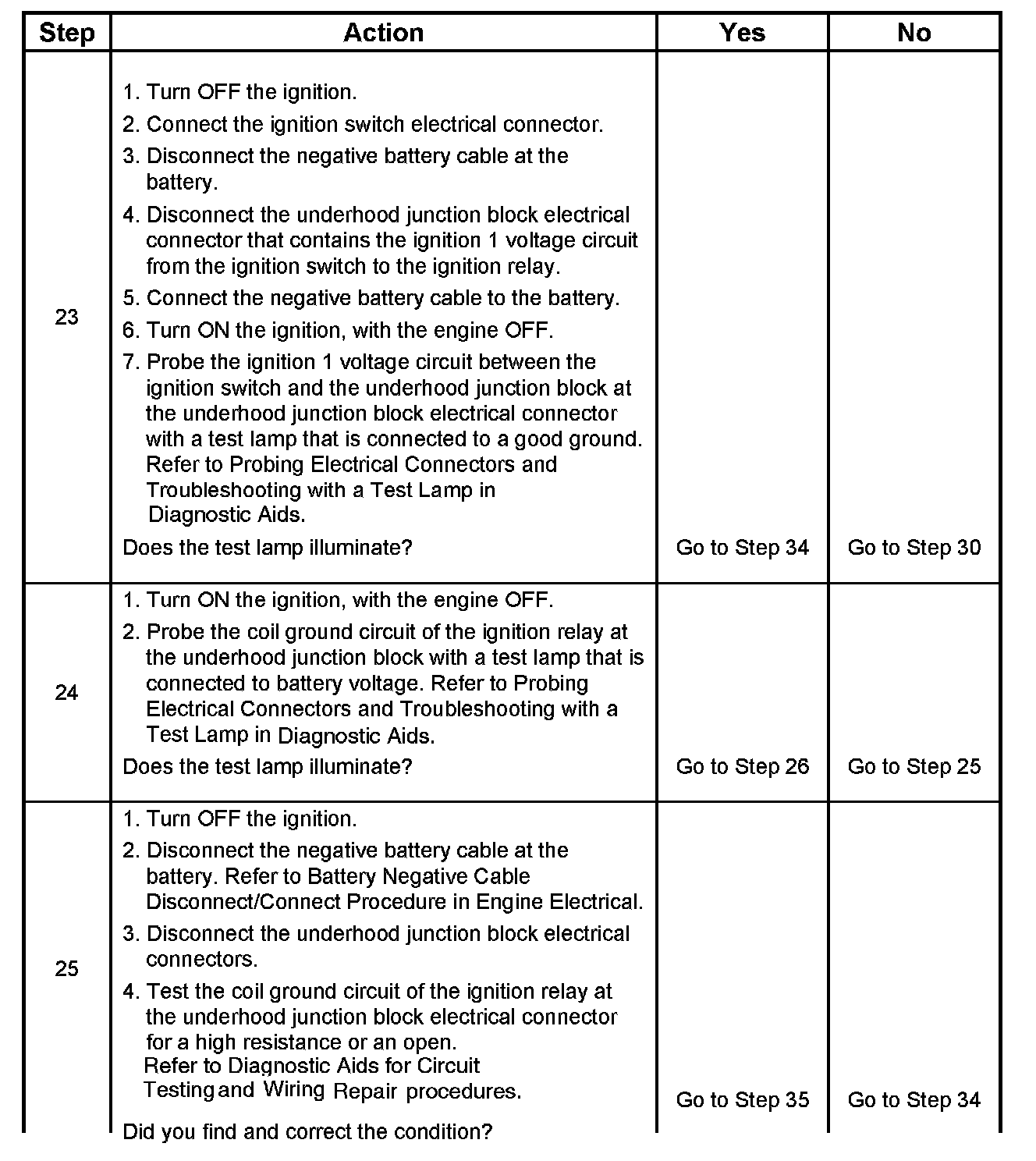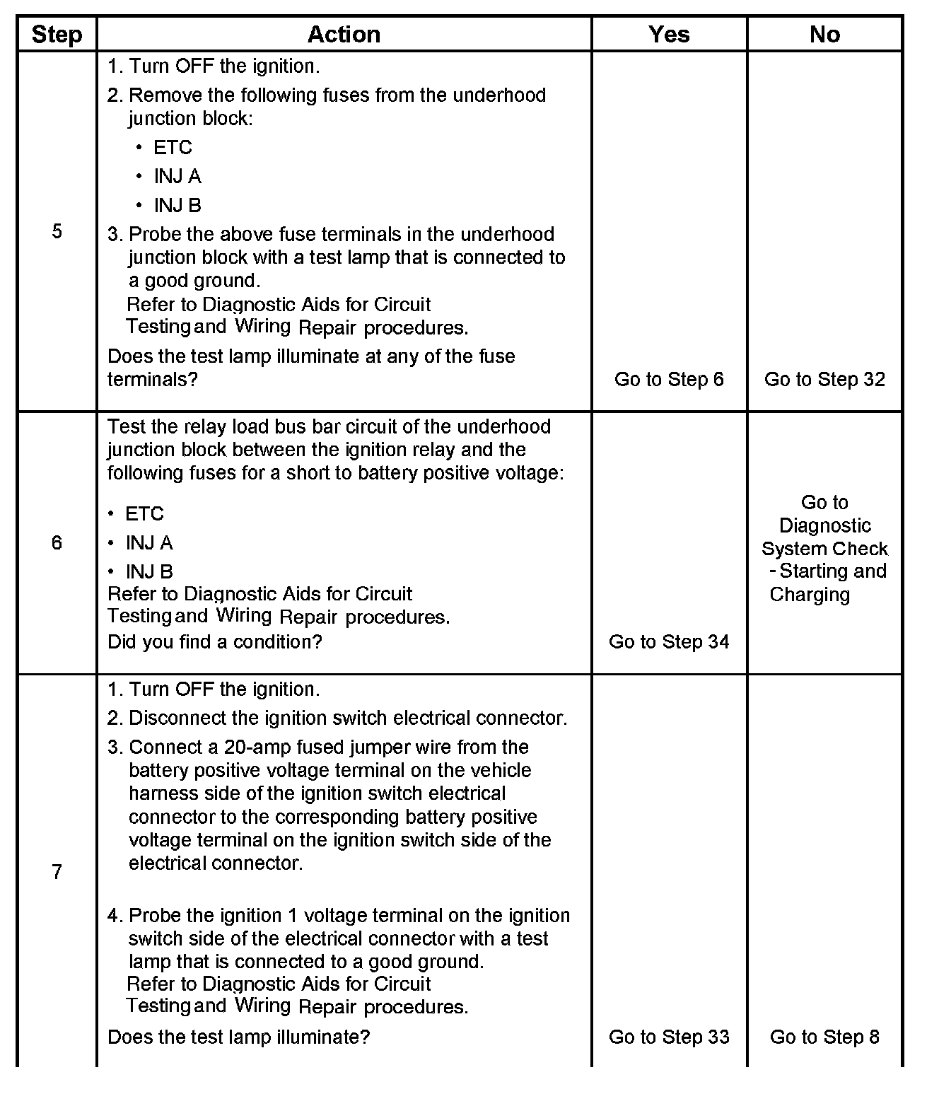 The ignition relay table assumes that the vehicle battery is fully charged. Refer to Battery Inspection/Test in Starting and Charging.