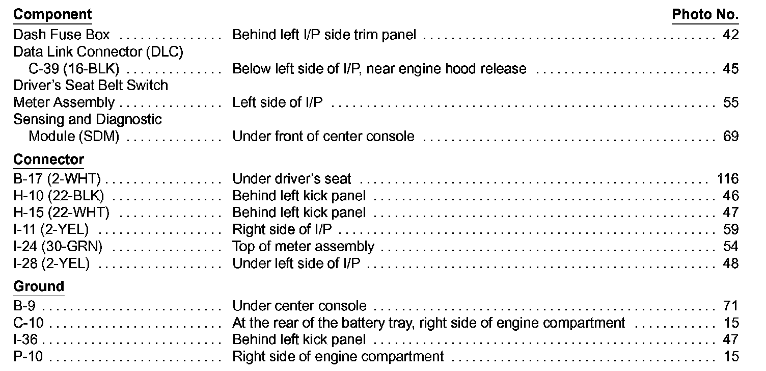 Supplemental Restraint System (SRS) Component Location Index: