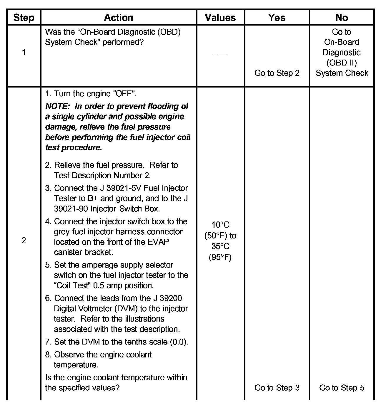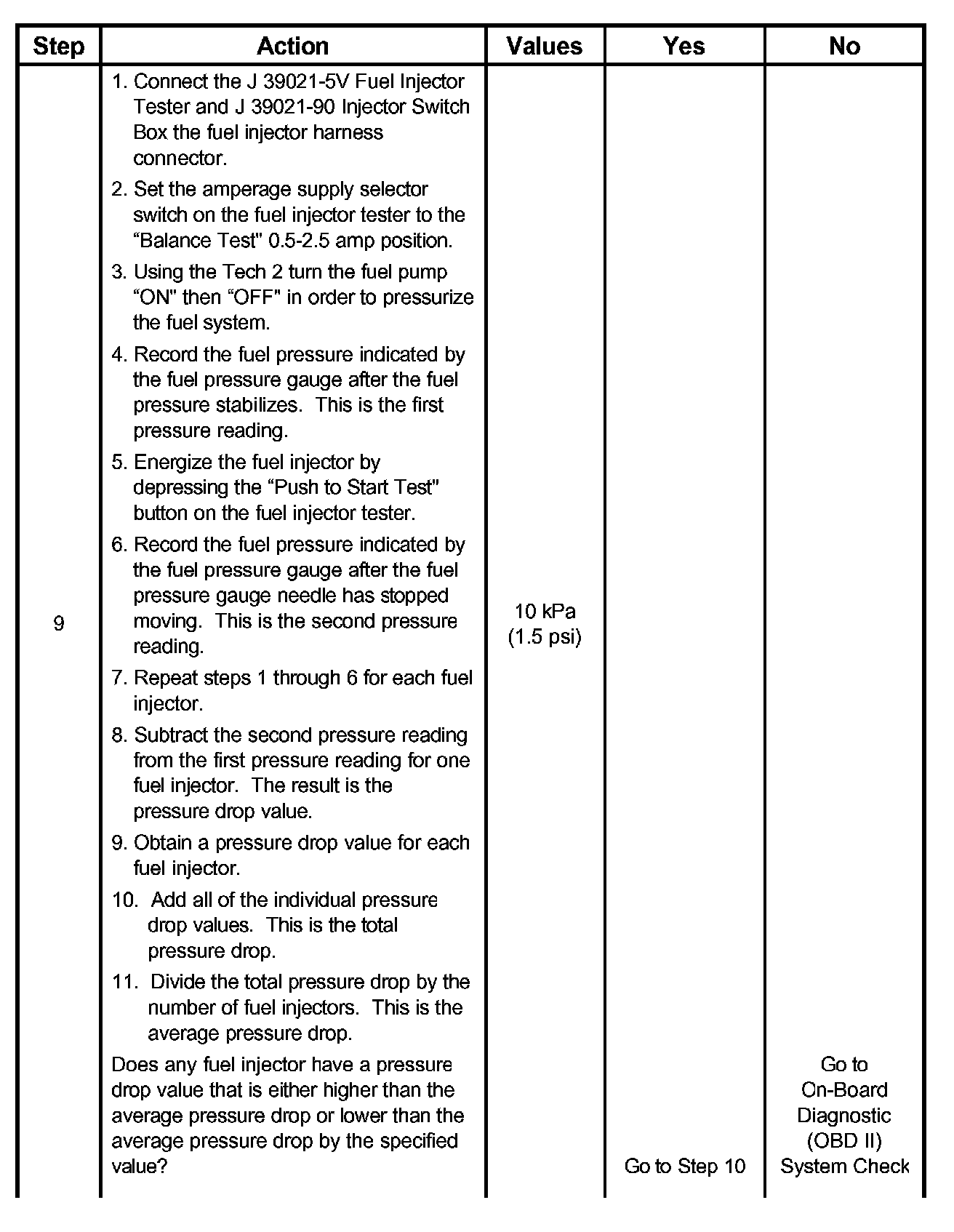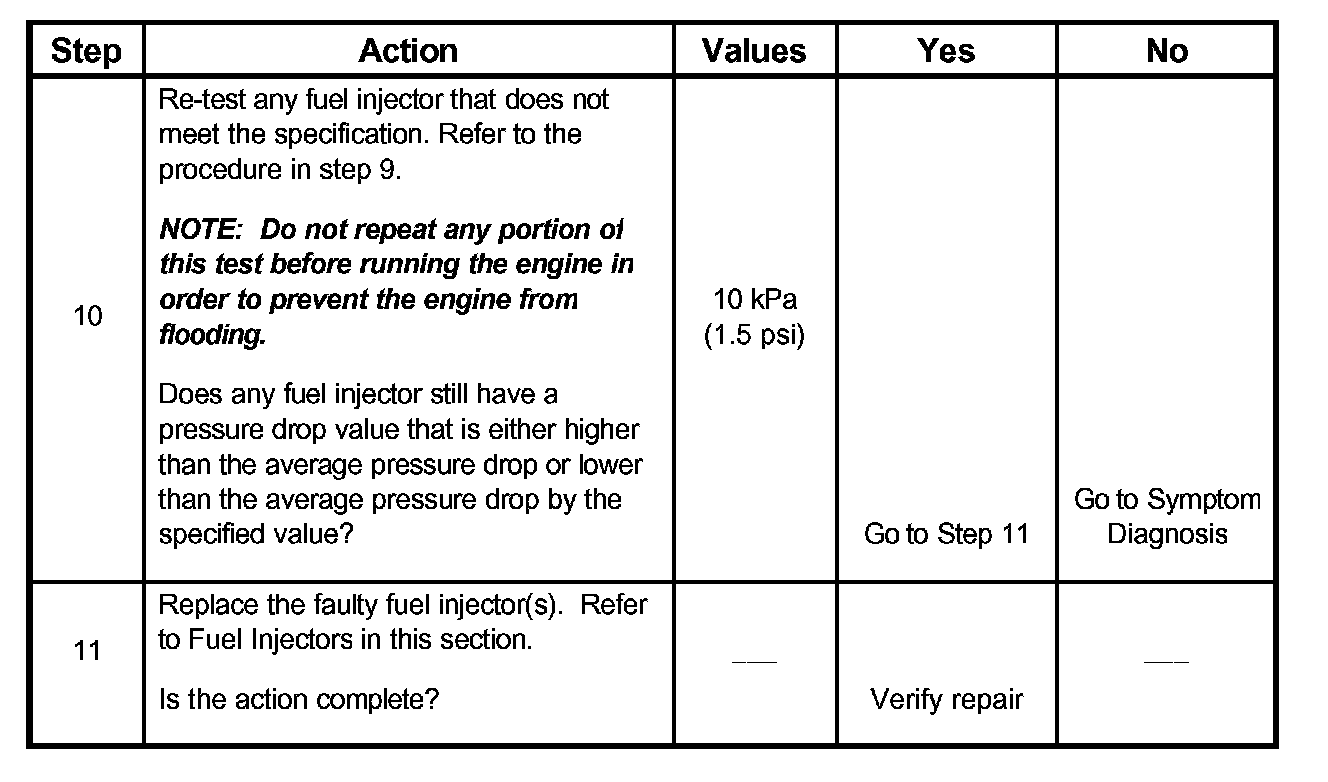 7. The Fuel Injector Balance Test portion of this chart (Step 7 through Step 11) checks the mechanical (fuel delivery) portion of the fuel injector.An engine cool-down period of 10 minutes is necessary in order to avoid irregular fuel pressure readings due to "Hot Soak" fuel boiling.