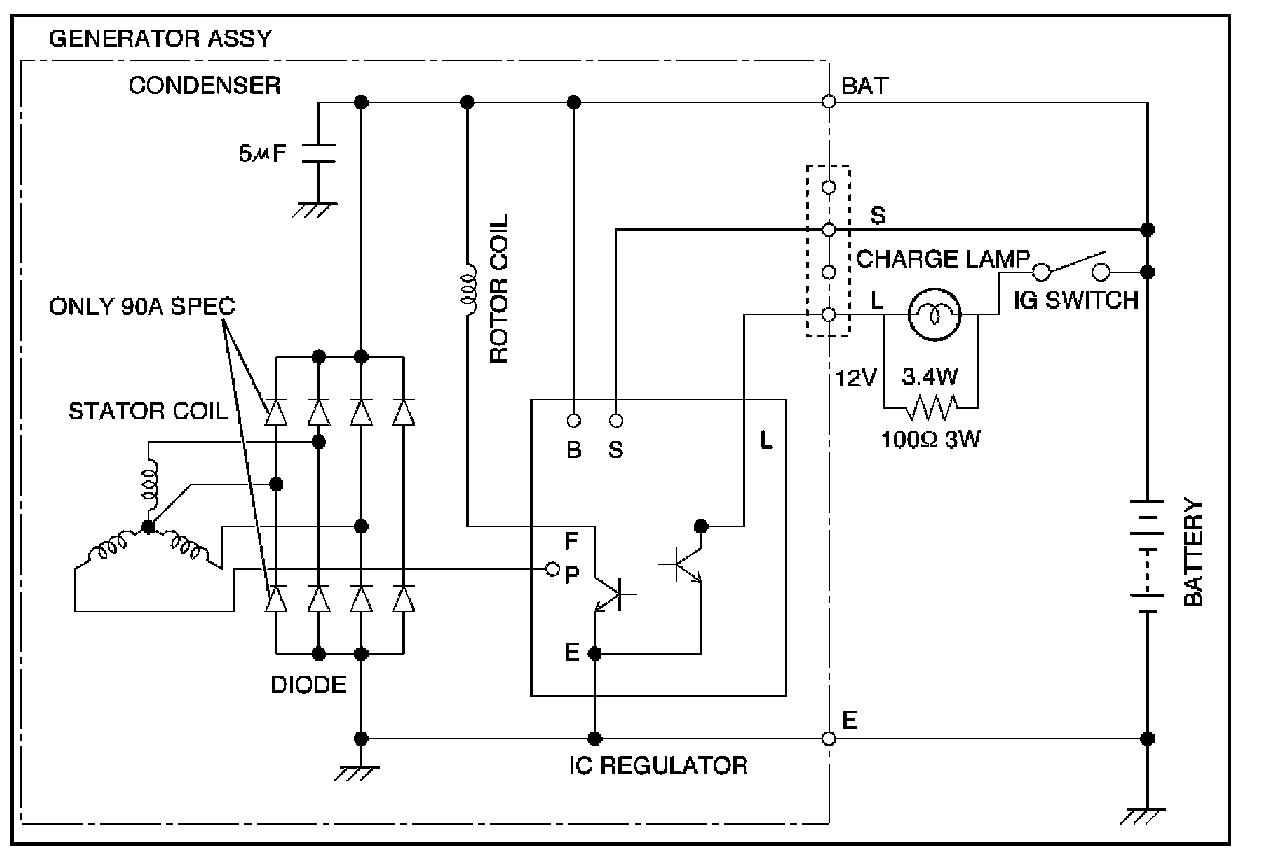 General On-Vehicle InspectionA basic wiring diagram is shown in the illustration. When operating normally, the indicator bulb will come on when the switch is turned on, and will then go out when the engine starts. If the indicator operates abnormally, or if an undercharged or overcharged battery condition occurs, the following procedure may be used to diagnose the charging system. Remember that an undercharged battery is often caused by accessories being left on overnight, or by a defective switch which allows a bulb, such as a trunk or glove box light, to stay on.