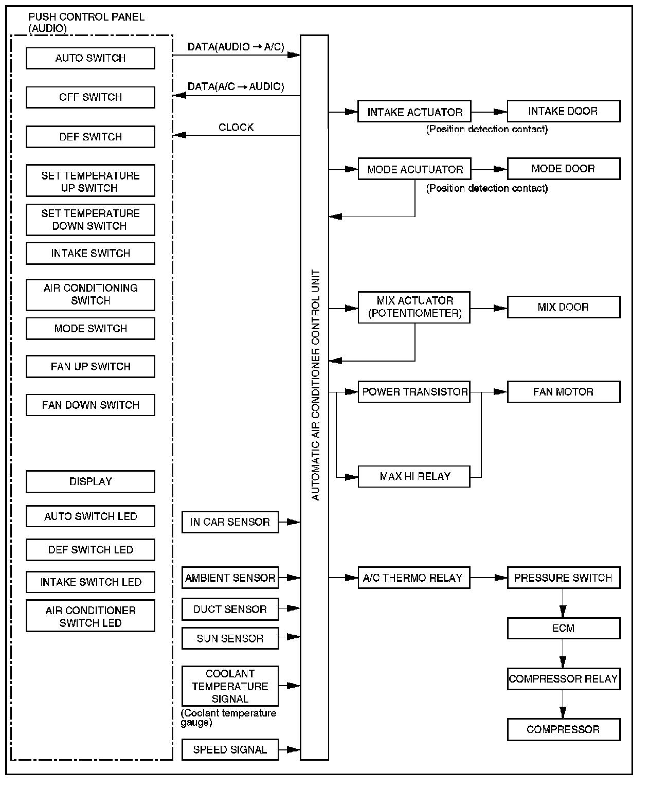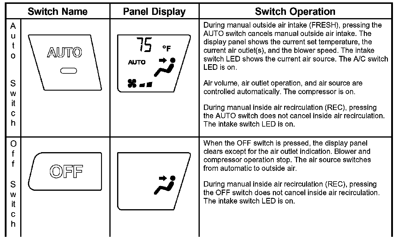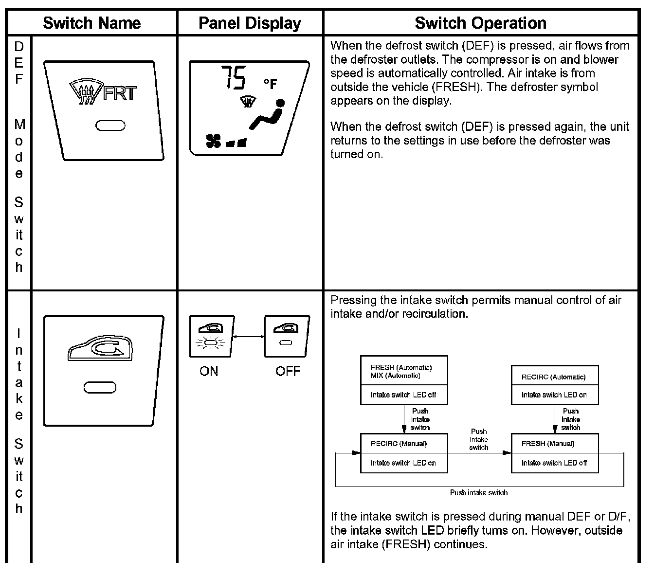 Automatic switching between outside air (FRESH), recirculated inside air (RECIRC), or a combination of the two (MIX) occurs in response to changes in outlet temperatures. The intake switch permits manual selection of the air source (FRESH or RECIRC). Mixing of the two sources is not possible during manual operation. When the defrost mode switch (DEF) is pressed, the system automatically switches to outside air intake.