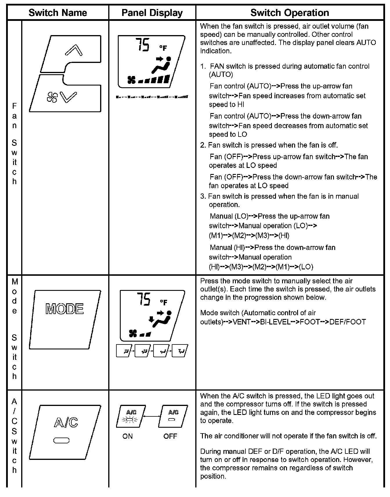 Appropriate air outlets (VENT, BE-LEVEL, FOOT, or DEF) are selected in response to changes in outlet temperatures. The mode switch permits manual selection of the desired air outlet.