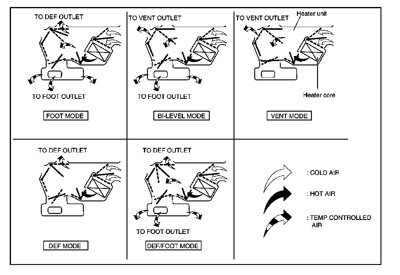 When the temperature control knob is in the "COLD" position, the air mix door closes to block the flow air to the heater core.