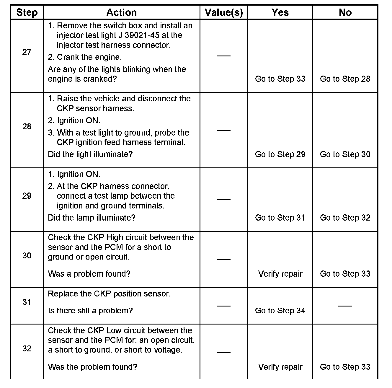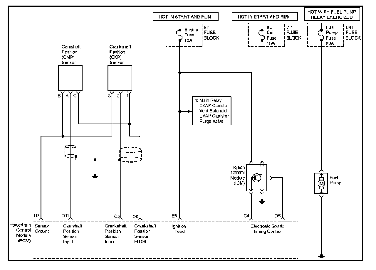 During crank, the PCM monitors the CKP 58X signal. The CKP signal is used to determine which cylinder will fire first. After the CKP 58X signal has been processed by the PCM, it will command all four injectors to allow a priming shot of fuel for all the cylinders. After the priming, the injectors are left OFF during the next four 58X reference pulses from the CKP. This allows each cylinder a chance to use the fuel from the priming shot. During this waiting period, a camshaft position (CMP) signal pulse will have been received by the PCM. The CMP signal allows the PCM to operate the injectors sequentially based on camshaft position. If the camshaft position signal is not present at start-up, the PCM will begin sequential fuel delivery with a 1-in-4 chance that fuel delivery is correct. The engine will run without a CMP signal, but will set a DTC code.