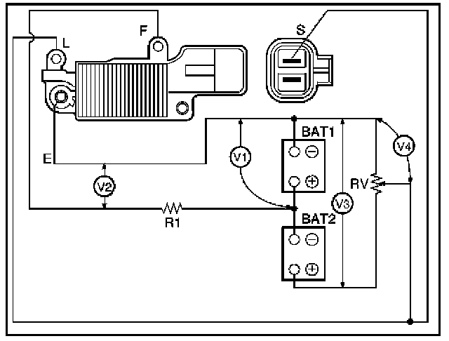 4. Measure the voltage at "V4" (the voltage across the variable resistor center tap and terminal E with the variable resistor resistance held constant). The measure voltage should be within the specified (14.4 ± 0.3 volts) limits. If it is not, the regulator must be replaced.