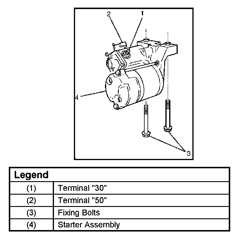 4. Disconnect starter wiring connector from terminals "30" (1) and "50" (2).