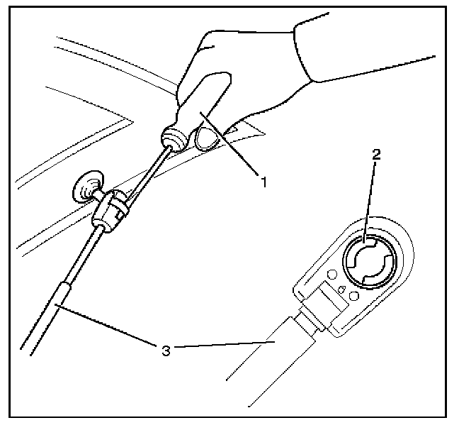 - Remove gas stay fixing screw and pull up the gas stay assembly (3) from the ball stud by spreading the retainer (2) holding the ball stud at the end of the gas stay with screwdriver (1), etc.