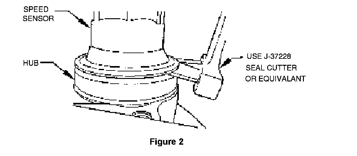 3. Insert J-37228 Seal Cutter between the hub mating surface and remove the speed sensor from the hub (see figure 2).