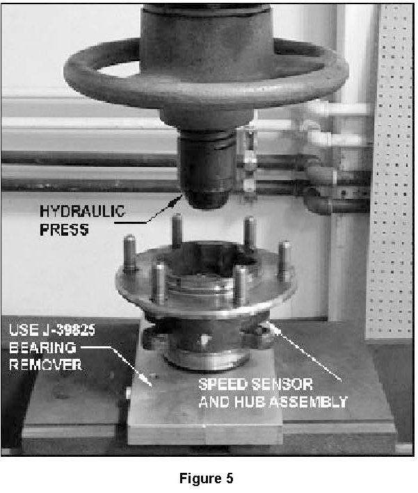 6. Place the hub assembly and speed sensor face down on J-39825 Bearing Remover. Using a hydraulic press, press until the hub and speed sensor are fully mated, applying 1.5 TONS (see figure 5).