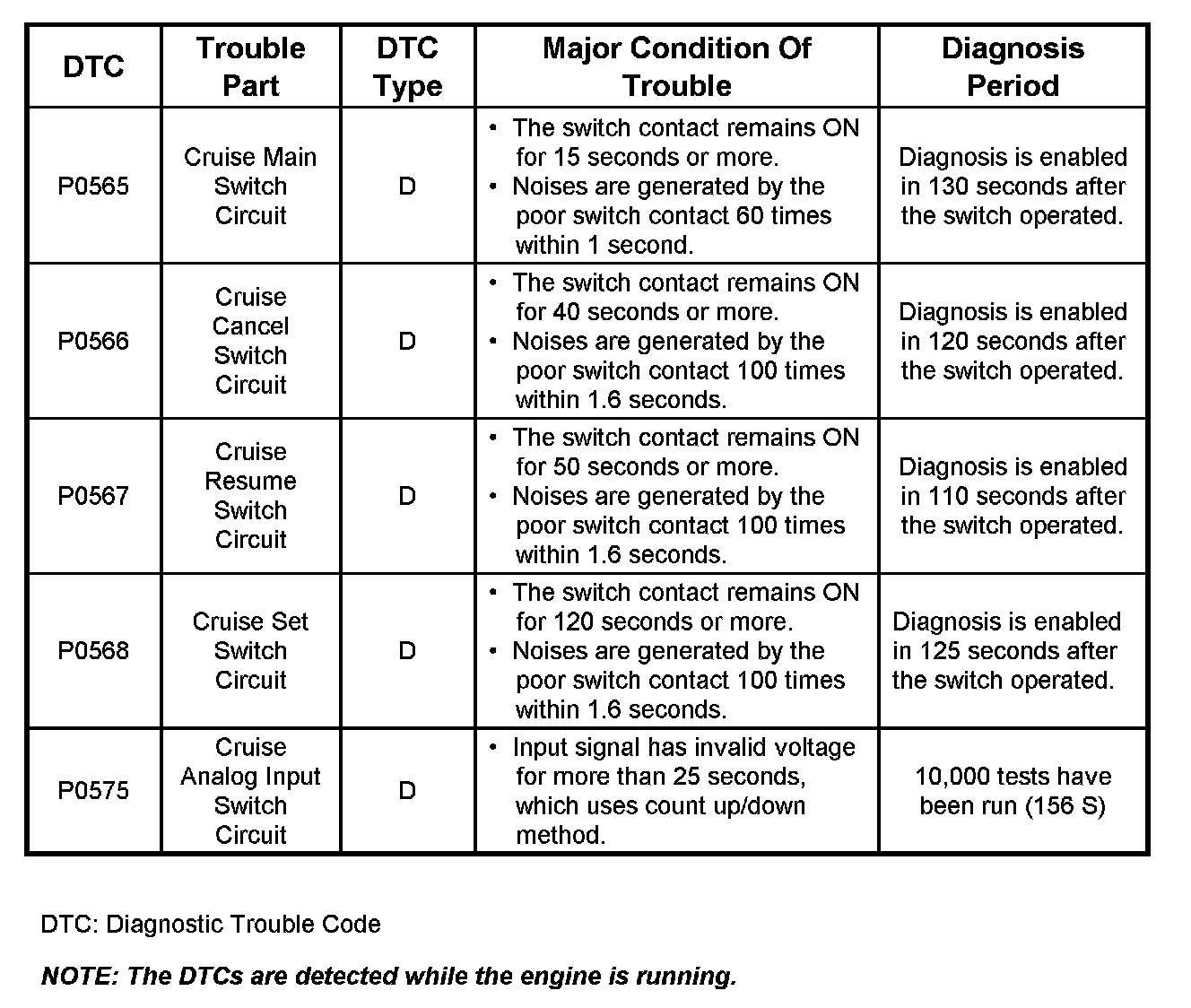 Cruise control system is controlled by the ECM as well as 6VE1 engine. DTC codes are stored in the ECM if troubles occur in the circuit. DTC codes categorized "type D" are shown only by the Tech 2 scan tool. The following chart only shows some typical DTCs for cruise control system. Refer to ECM Diagnostic Trouble Codes in Driveability and Emissions - 3.2L or PCM Diagnosis in Driveability and Emissions - 2.2L for entire DTC diagnosis.