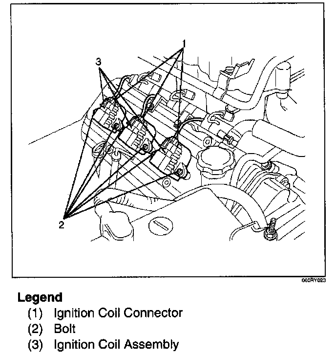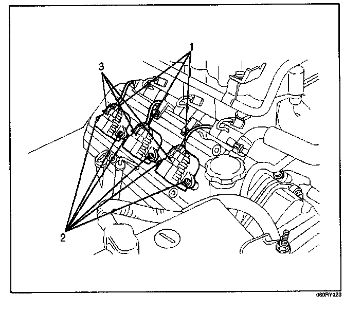 Connect ignition coil connector (1) and ignition coil (3), then tighten bolt (2) to the specified torque.