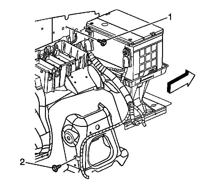7. Install the negative battery cable ground terminal bolt (2) at the left wheelhouse panel.