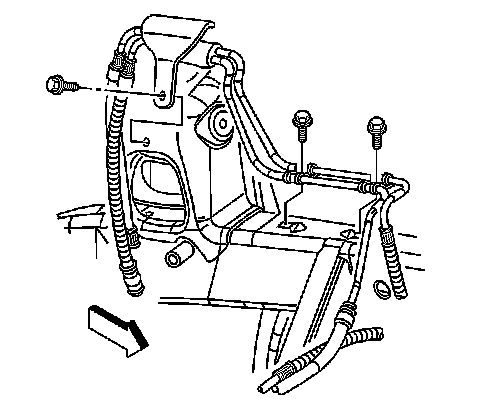 7. Install the power steering hose assembly to frame brackets retaining bolts.