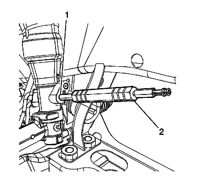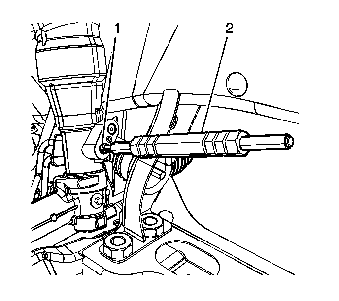 25. Install the seal extraction end of the J 44586 (2) to the power steering gear oil seal (1).