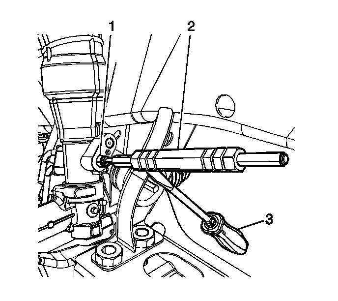 26. Extract the power steering gear oil seal (1) from the power steering gear using the J 44586 (2) with the aid of a flat-bladed tool (3) for additional leverage.