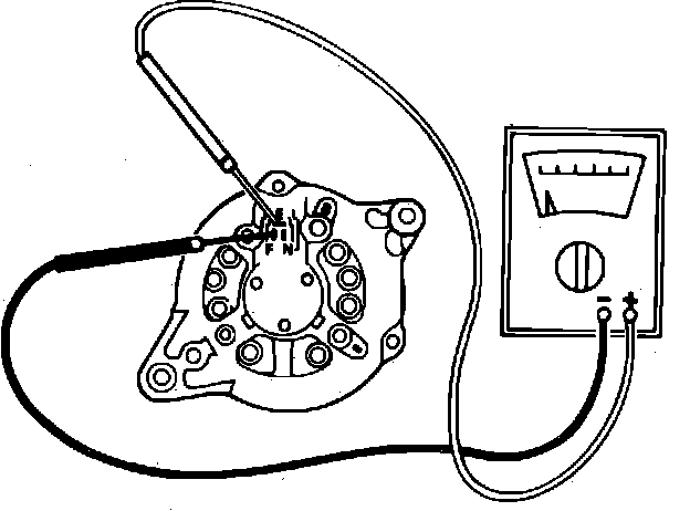 1. Check rotor coil resistance using an ohmmeter across terminals F and E, Fig. 1. Reading should be 4.2 ohms. If resistance is zero, a short is indicated. If resistance is infinite, poor brush contact, broken lead wire or an open rotor coil is indicated.