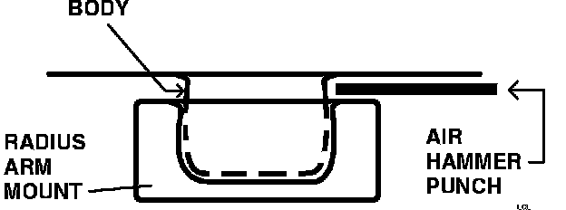 6. Remove radius arm from mount with an air hammer with a 3/8" flat punch, or equivalent. Direct punch straight in against body part of mount.