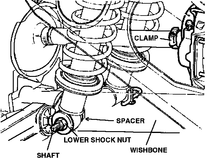 3. Lift wishbone assembly and refit lower shock mounting shaft and spacers.