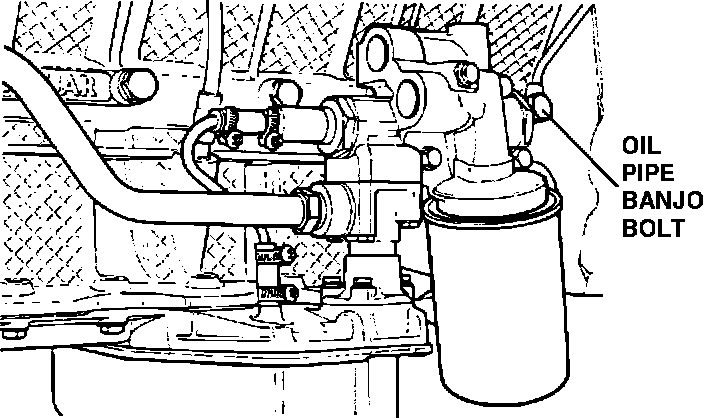 - Remove the banjo bolt from the cylinder block oil gallery and manoeuvre the oil pipes clear.