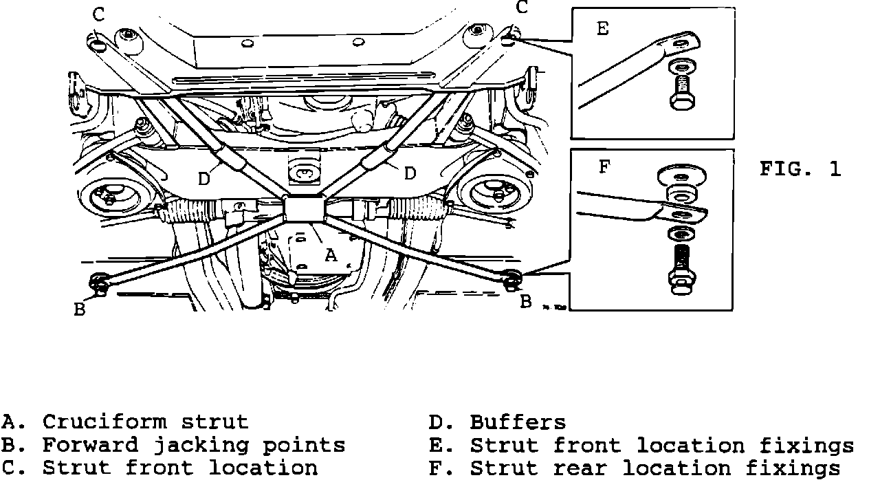 Buffers (Fig. 1 D) are attached to the cruciform strut to ensure that no metal contact occurs between the strut and the suspension cross-beam. The strut front location (Fig. 1 E) is secured by a bolt and washer. The strut rear location (Fig. 1 F) is secured by a jacking stud, washer, spacer and reinforcing disc.