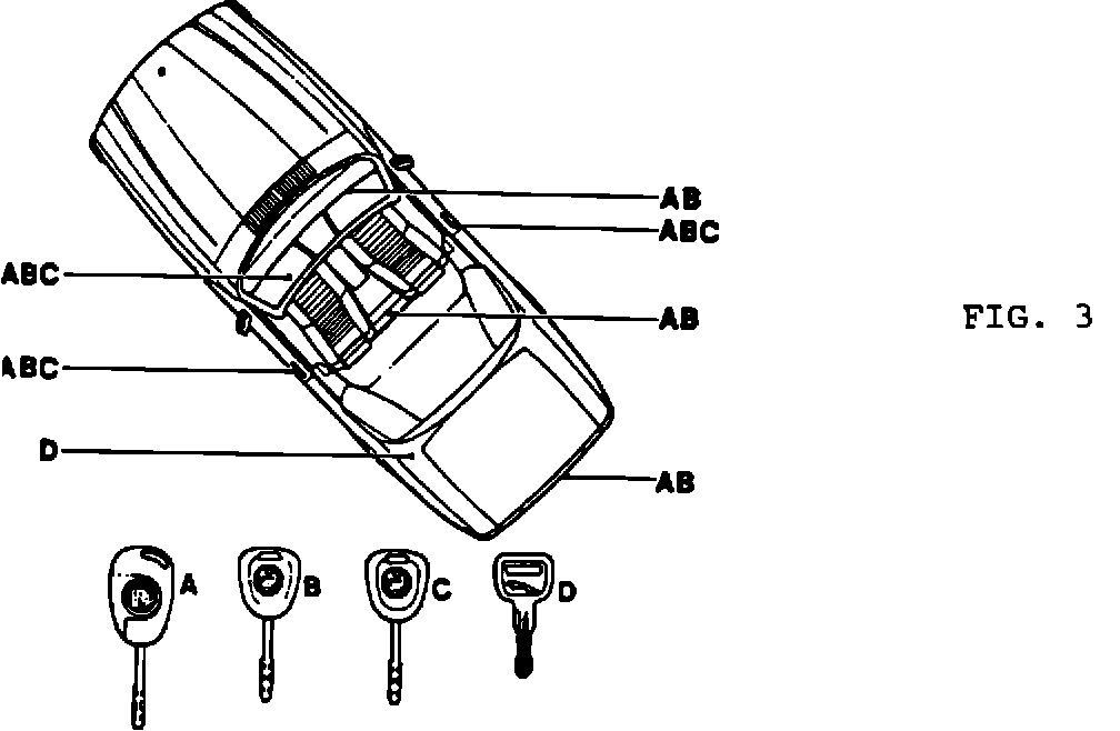 The large black key (Fig. 3 A) and the small black key (Fig. 3 B) operate the combined steering column lock/Ignition switch and the door, luggage compartment, glove compartment and rear stowage compartment locks. The small green key (Fig. 3 C) locks all the Tibbe locks but does not unlock the luggage compartment, glove compartment, and rear stowage compartment locks. The all metal key (Fig. 3 D) operates the fuel filler cap lock (Convertible only).
