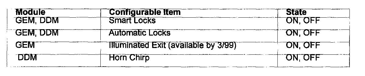 There are two modes of configuration data. The first type requires configuration information so that the module can interact with the vehicle correctly. This information will be transferred into the new module so that the new module will contain the same settings as the old module. Modules on the vehicle that require configuration when installing a replacement module are: