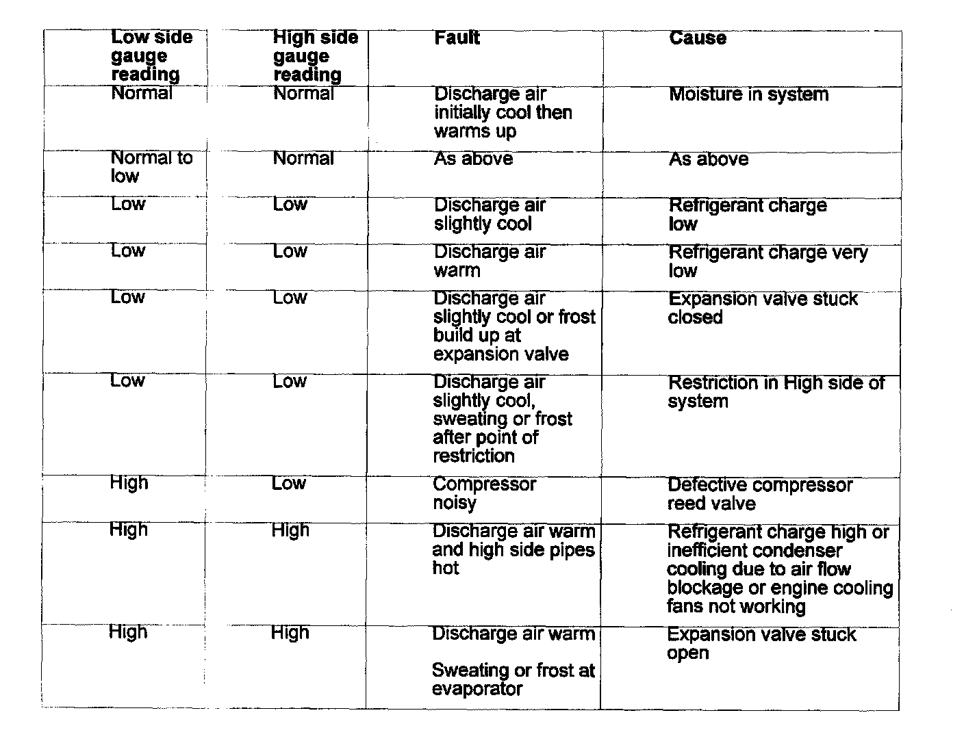 This table should be used in conjunction with the graphical representations of "High side" pressure / ambient temperature and "Low side" pressure / evaporator temperature.