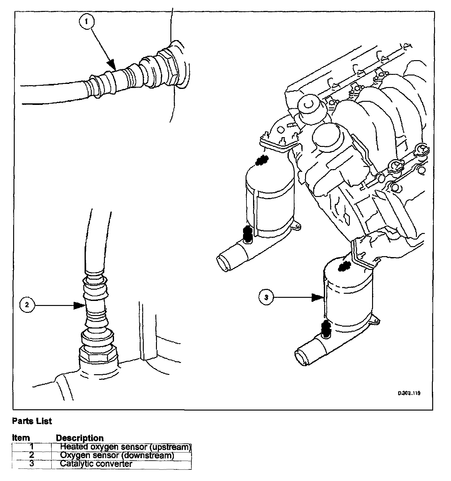 An oxygen sensor (without heater) is located at the converter outlet.