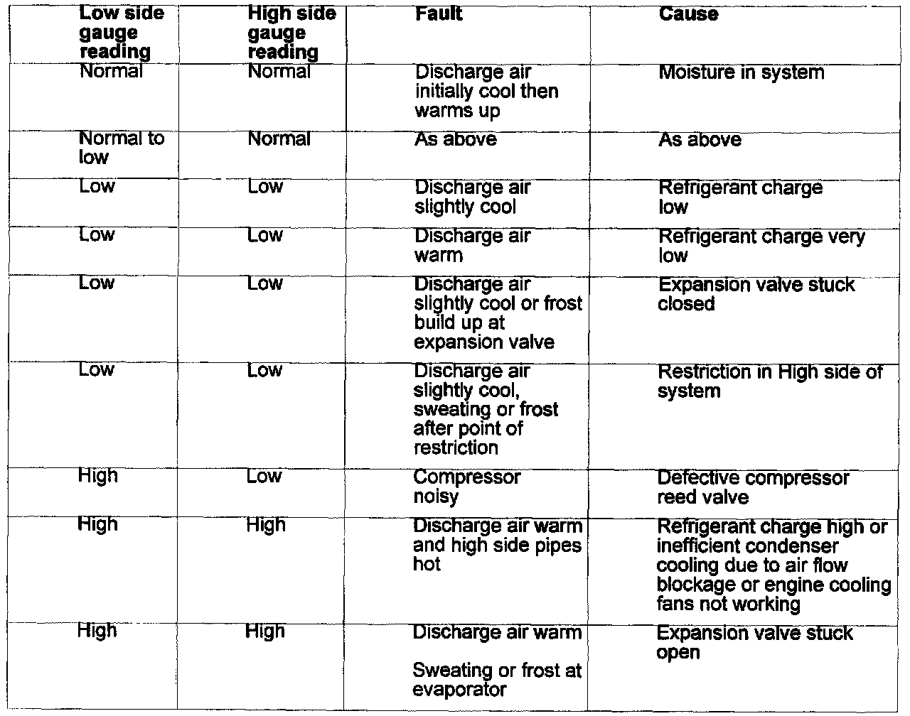 This table should be used in conjunction with the graphical representations of 'High side' pressure/ambient temperature and 'Low side' pressure/evaporator temperature. Stabilizing the System