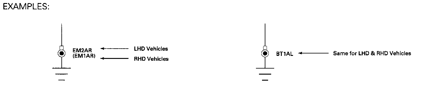 Where the ground designation differs from LHD to RHD, the RHD ground is shown in parentheses. If the ground designation is the same for LHD and RHD, only one ground designation is used.