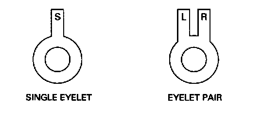 Two eyelet variations are used: a single eyelet and an eyelet pair. The single eyelet has a single 'leg', which is identified by an S; the eyelet pair has two 'legs', identified as L (left) or R (right).